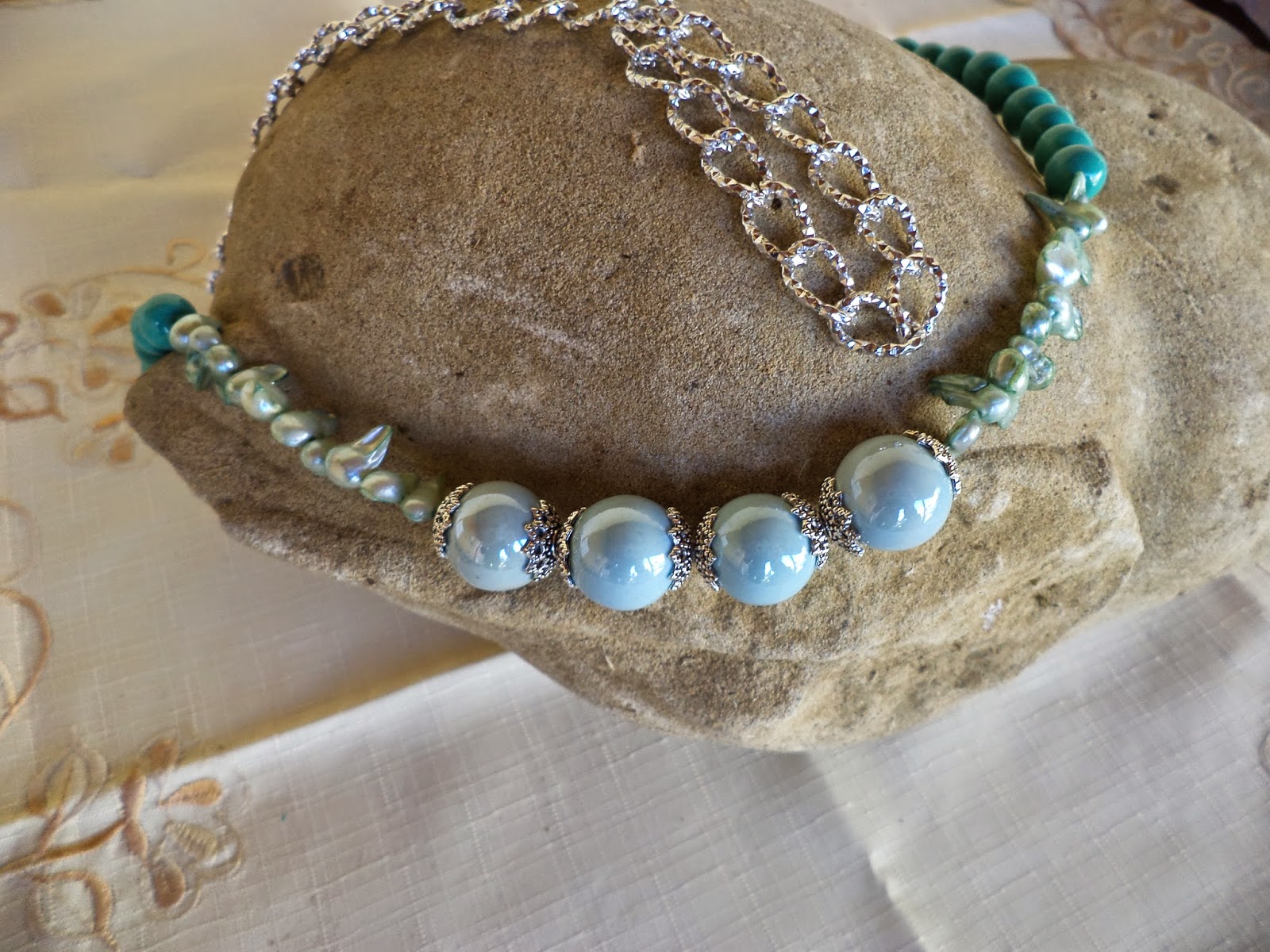 Quante volte capita di dover fare un abbinamento di un gioiello a qualche capo di abbigliamento e puntualmente manca sempre qualcosa (perlomeno a me capita spesso). Se si ha la maglia del colore giusto manca la collana ,se si ha la collana manca il bracciale da abbinarci. Per risolvere questi inconvenienti bisogna quindi avere almeno qualche parure completa così da essere perfette anche nei dettagli (che poi sono quelli che fanno la differenza).Ne ho creato qualcuna di diversi colori, quella che oggi posterò è quella che penso possa essere più indicata per la bella stagione e quindi per i colori tenui degli abbinamenti. Ecco a voi carissimi....fatemi sapere cosa ne pensate un abbraccio.